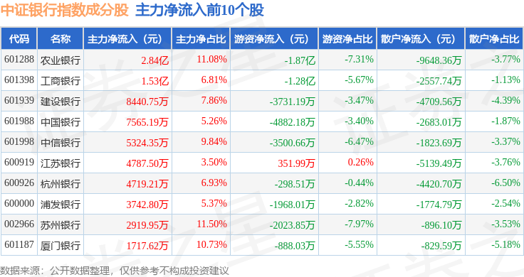 资金流向方面,中证银行(399986)指数成份股当日主力资金净流出合计6.6亿元,游资资金净流入合计9934.91万元,散户资金净流入合计5.6亿元。成份股资金流向详情见下表: