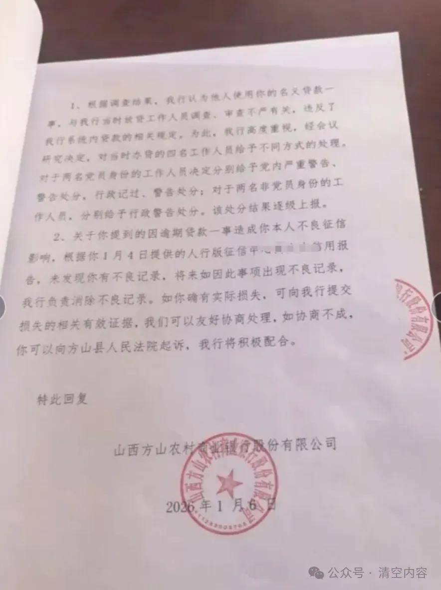 2026,年1月6日,山西方山农村商业银行股份有限公司对该事件作出回复: