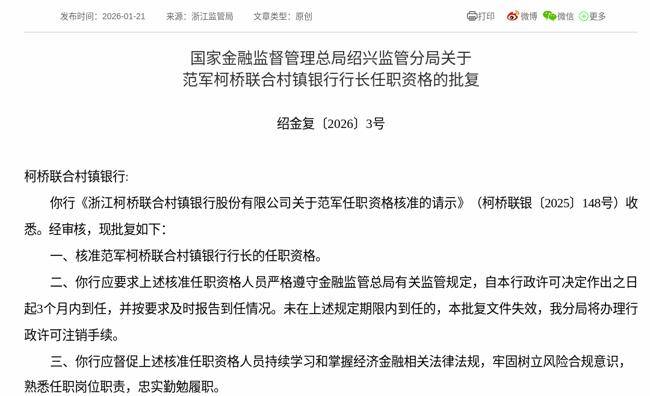 2026年1月21日,根据国家金融监督管理总局消息,《浙江柯桥联合村镇银行股份有限公司关于范军任职资格核准的请示》获得通过,批复范军浙江柯桥联合村镇银行股份有限公司行长的任职资格。