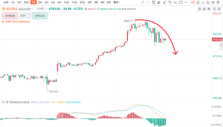 黄金经过三天上涨,最高在4890附近,接近4900高点,前面讲过,黄金在这个周期中的上涨是由于市场刺激的原因,但一旦消息面消退,黄金就会走出暴跌的风险,所以,在周三午夜黄金出现了接近150美金的下跌,并且这波下跌还在持续,那么基本符合张德盛的预期,这波向下的时间点在周三或者周四。既然周三走出了下跌,那么,周四回延续走出下跌的力度,今天深跌一波的话就可以看到本周起涨点4650或者周初的调高窗口4600。按照技术面来看,日线周期的大跌即将开始,日线已经形成了顶点的形态,目前需要跌破5,10日均线的才能确定1月的大跌,所以,暂时还是多头趋势,只不过是调整,日线的支撑点在4730,4650,其中4650是这波强势的关键点。H4周期已经收口了,特别是午夜的下跌直接破位5,10日均线的支撑,现在需要看跌破布林中轨4730,然后再看去4600甚至更低,所以在这个时间节点上,周四要关注黄金的调整空间,下方的预期以及给出了,上的需要注意4810,4835两个压制点。目前手上有低位空单和高位多单不知道如何处理,我会给予我粉丝最大的帮助。