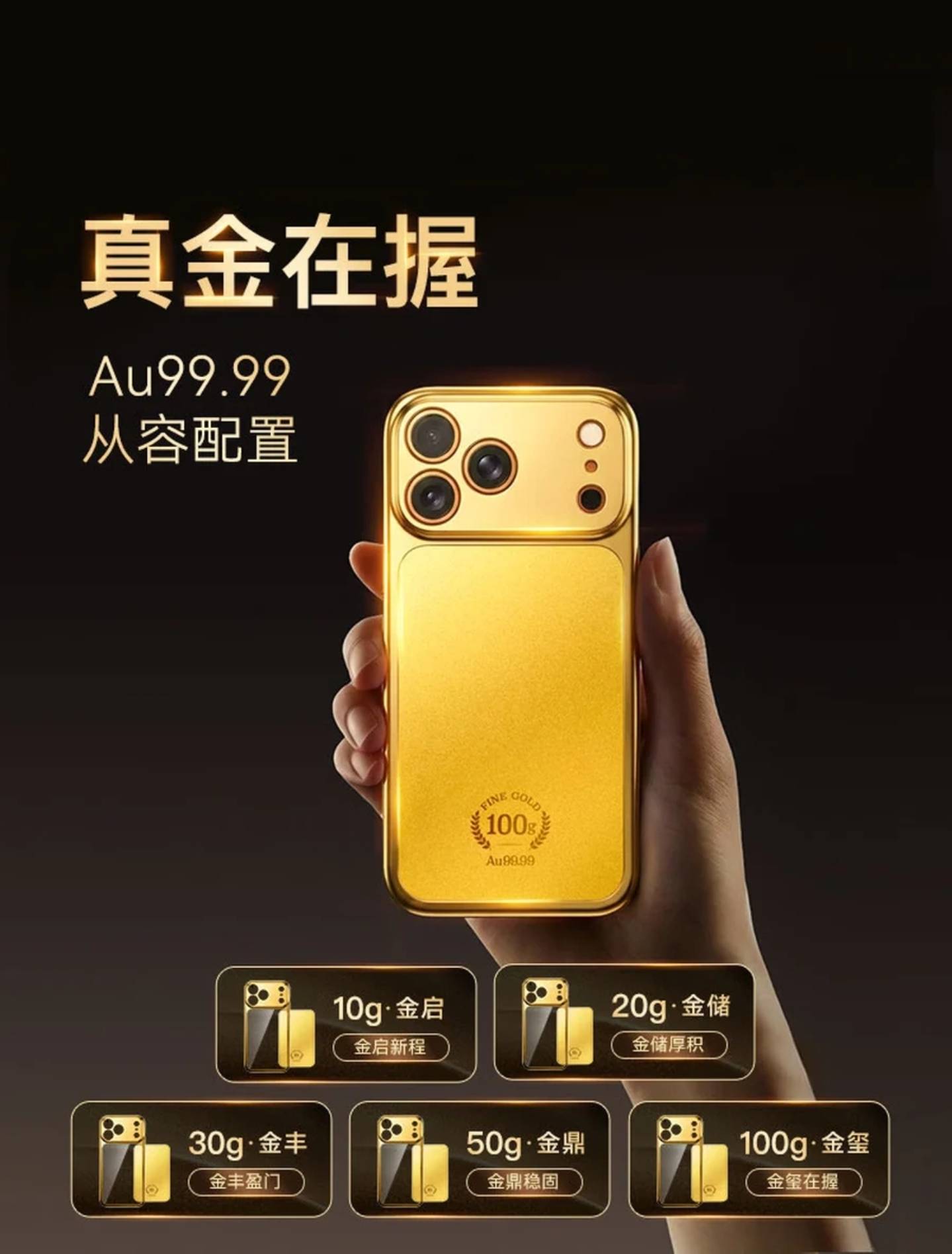 这手机壳原本分五个重量版本,从 10 克到 100 克不等,价格也跟着克重走:10 克的金启卖 11299 元,20 克的金储卖 22499 元,30 克的金丰卖 33699 元,50 克的金鼎卖最高配 100 克的金玺直接冲到 112299 元。
