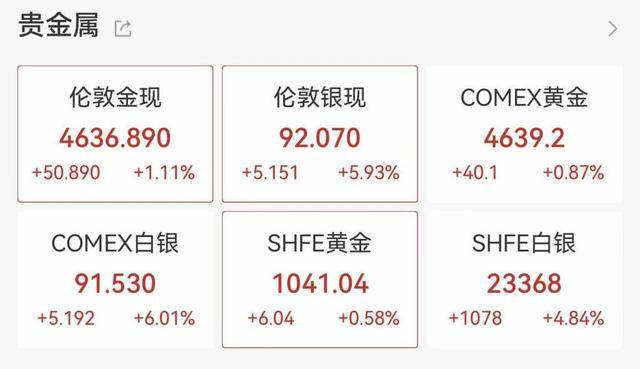 1月14日亚太交易时段,现货白银(伦敦银现)史上首次站上92美元/盎司大关,盘中最高触及92.2美元/盎司,日内涨近6%,年内涨幅突破28%。现货黄金(伦敦金现)同步刷新历史高位,达到4641.853美元/盎司,年内涨幅超7%。