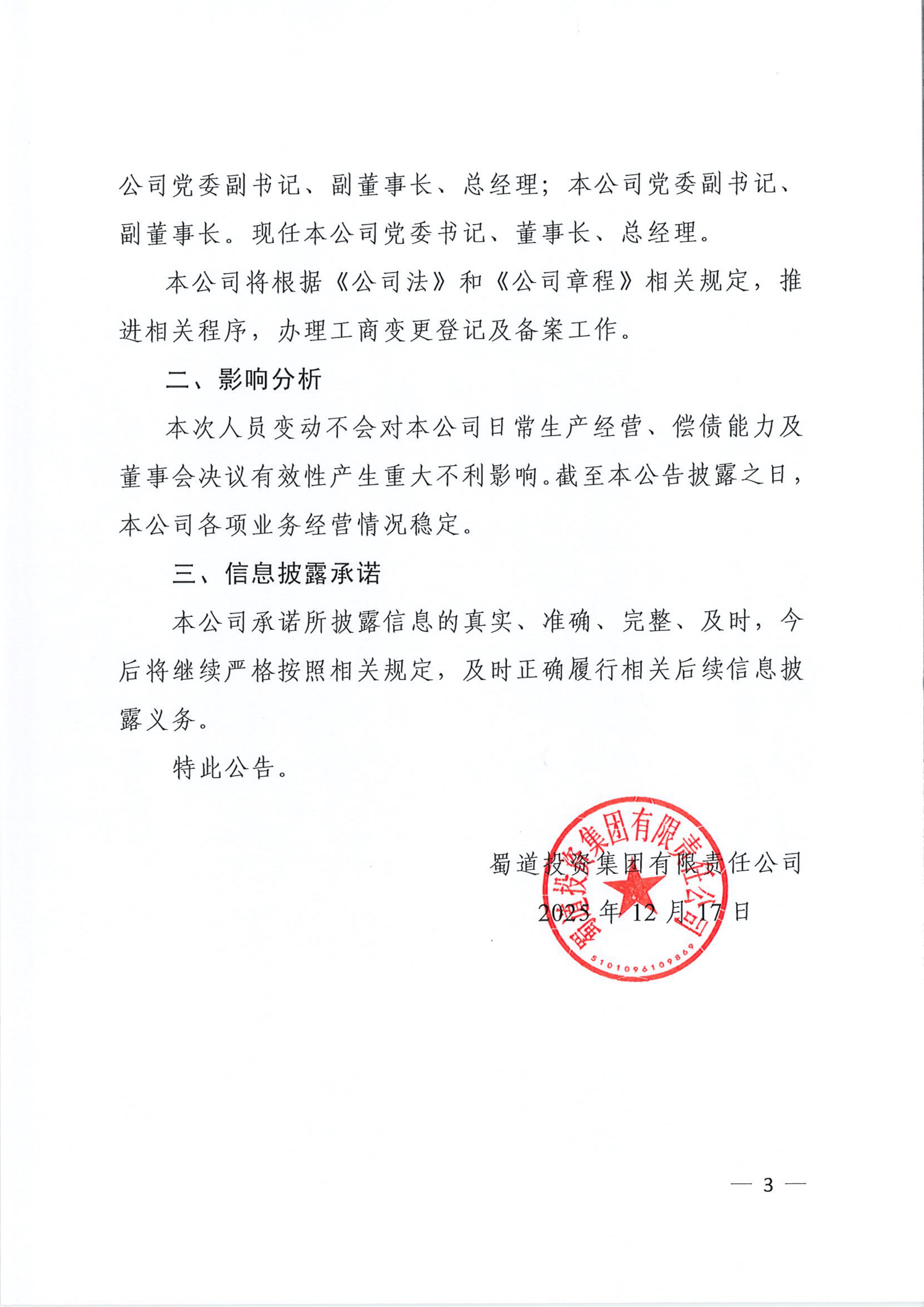 债券-25蜀道KY3-蜀道投资集团有限责任公司关于董事长发生变动的公告