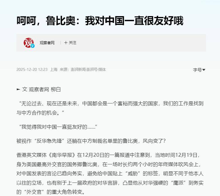 曾经在公众面前咄咄逼人的美国国务卿,最近却突然改口。这场变化的最明显体现出现在2025年底的一场记者会上,当时马可·鲁比奥面对镜头时,语气出奇地平和,谈论中国的问题。这一幕让许多熟悉他以往作风的人几乎不敢相信自己的眼睛。你要知道,几年前,作为华盛顿对华强硬派的代表,鲁比奥无论是针对涉疆问题的谣言,还是推动涉港法案,都表现得异常激烈。