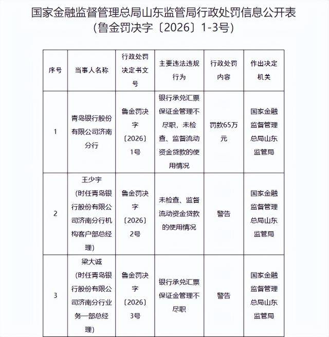 1月26日,国家金融监督管理总局山东监管局发布行政处罚信息公开表,青岛银行股份有限公司济南分行因银行承兑汇票保证金管理不尽职、未检查监督流动资金贷款的使用情况等违法违规行为,被罚款65万元。