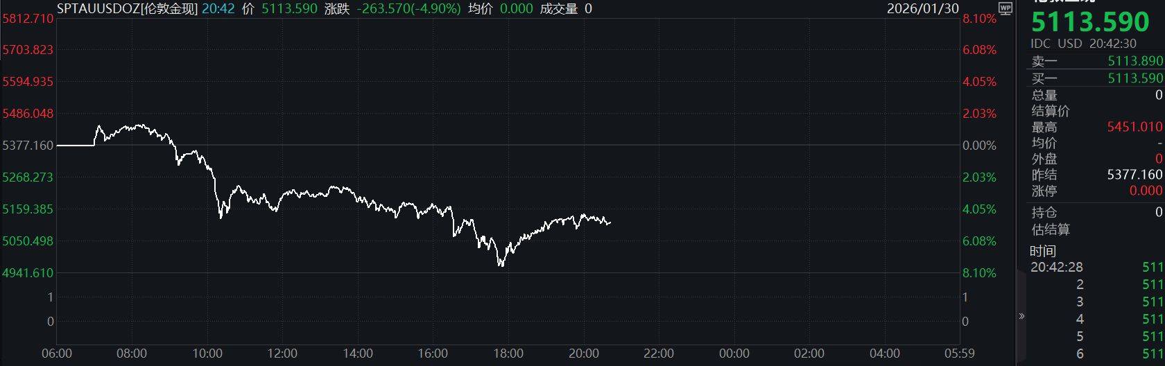 不过,这一轮上涨势头在巅峰时刻戛然而止。1月29日当天,金价在创下历史新高后急转直下,出现惊人抛售。现货黄金价格从5530美元/盎司附近跌至5105.83美元/盎司,日内最大跌幅达5.7%,一度跌超400美元。1月30日,金价呈现单边急速下行,盘中一度跌破5000美元/盎司关口,跌幅超过8%。