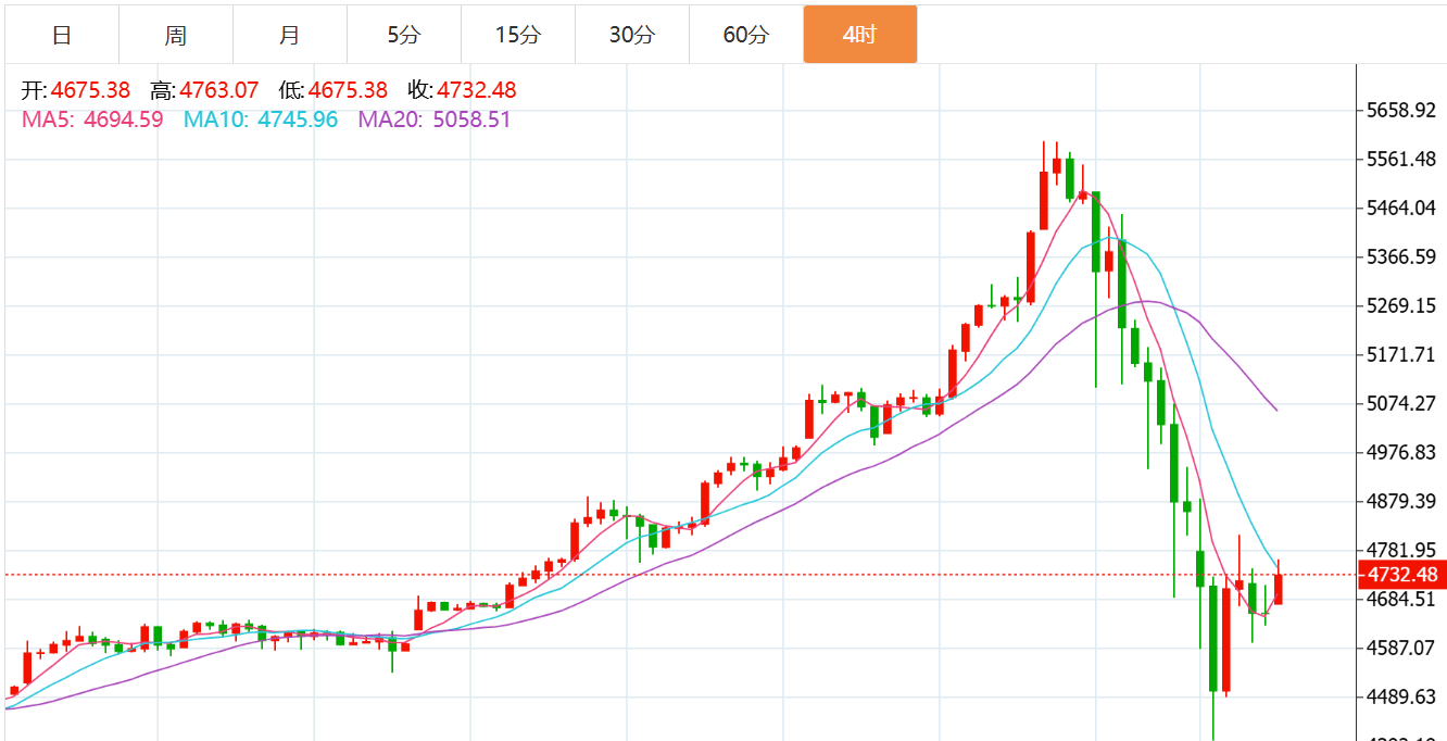 黄金技术面分析:黄金日线级别连续三日从5597猛打压至今日最低4400附近,1200点的确非常狠,积存金价格也刺穿了1000整数关口,不过牛市的底层逻辑并未发生改变,出现暴涨暴跌走法,无非就是资本家丑恶的嘴脸,进行疯狂多空杀,重新进行洗盘;今日直接打到了66日均线,它是前期3500那次承压盘整4个月以来一直坚守的关键均线,所以也提及它是最后的关键,四浪回调也不应该破一浪高点4380,因此后市只要能稳住4380-4400上,就应该要展开底部的宽幅整理过程,以短期5日、10日作为承压点,今日低点之上,进行大范围运行,逐步把波动率给降低下来;那么这种几百点的宽幅扫荡走法,日内短线仍是非常难把握的,动不动就是几分钟几十点,甚至百点上,心理承压压力也会逐步较大,建议多看少动,卡极端上下位置再试探,小仓,带防守;等它出现底部某一个震荡雏形范围了,再去上下把握会相对好些;黄金小时线级别来看:亚盘基本延续了上周五跌幅,继续恐慌性砸盘,欧盘触及4403出现一波探底拉升,回升至4800关口;这一来一回又基本是800点,多空巨震;接下来留意4800一线阻力,能突破站上,才能测试4950上;反之持续压制,就要维持底部整理,下方支撑4550-4500,阻力4800;综合来看,黄金今日短线操作思路上贺博生建议以反弹做空为主,回踩低多为辅,上方短期重点关注4810-4860一线阻力,下方短期重点关注4640-4590一线支撑。