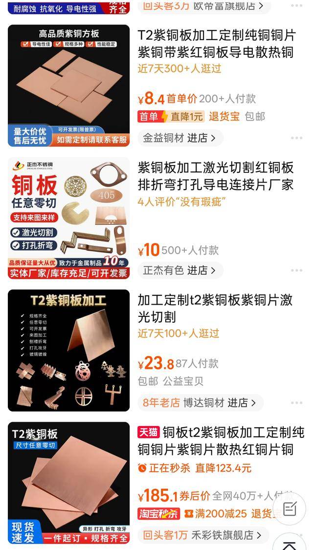 实际上,早在“投资铜条”爆火之前,电商平台上已有不少工厂或五金店,提供定制铜片、铜块、铜条服务。从评论来看,买家购铜用途五花八门,包括个人制作手工、小饰品,用于导电导热、储物收纳、书法镇纸等,而这些铜产品的价格普遍较目前投资铜条的“市价”便宜。例如,记者向某五金店咨询订购一块“10mm*20mm*200mm”的T2紫铜条,系统显示价格为38.5元。卖家告诉记者,T2紫铜是工业纯铜的一种,其对应的国标意味着含铜量不低于99.90%。如按照纯铜密度做简单计算,可得出该块紫铜条的实际重量约为358克,交易价格相当于107.5元/公斤。