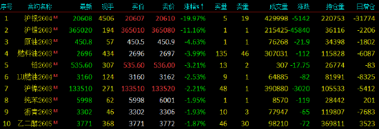 2026年2月3日,早盘开盘,国内期货主力合约跌多涨少,沪银跌近20%,沪锡跌超11%,SC原油跌超4%,燃料油、铂跌超3%,低硫燃料油、沪镍跌超2%。涨幅方面,集运欧线、氧化铝、PVC涨超1%。
