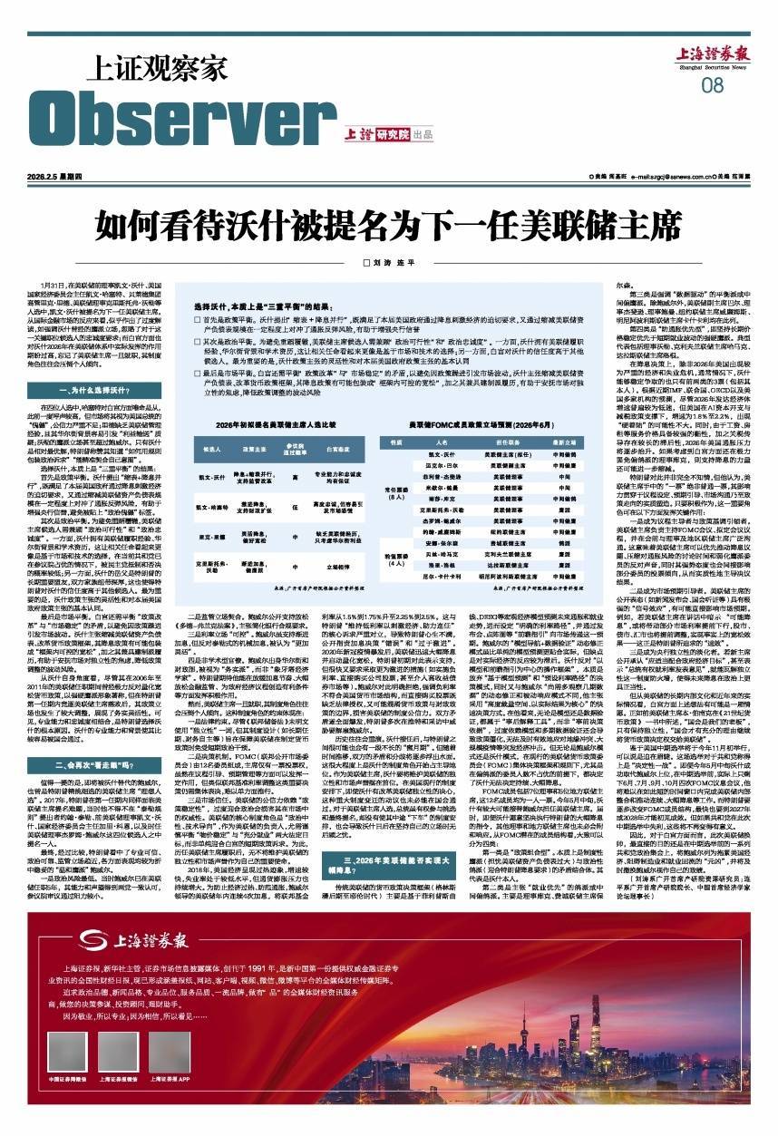 选择沃什,本质上是“三重平衡”的结果: □ 首先是政策平衡。沃什提出“缩表+降息并行”,既满足了本届美国政府通过降息刺激经济的迫切要求,又通过缩减美联储资产负债表规模在一定程度上对冲了通胀反弹风险,有助于增强央行信誉 □ 其次是政治平衡。为避免重蹈覆辙,美联储主席候选人需兼顾“政治可行性”和“政治忠诚度”。一方面,沃什拥有美联储履职经验、华尔街背景和学术资历,这让相关任命看起来更像是基于市场和技术的选择;另一方面,白宫对沃什的信任度高于其他候选人。最为重要的是,沃什政策主张的灵活性和对本届美国政府政策主张的基本认同 □ 最后是市场平衡。白宫还需平衡“政策改革”与“市场稳定”的矛盾,以避免因政策躁进引发市场波动。沃什主张缩减美联储资产负债表、改革货币政策框架,其降息政策有可能包装成“框架内可控的宽松”,加之其兼具建制派履历,有助于安抚市场对独立性的焦虑,降低政策调整的波动风险 1月31日,在美联储前理事凯文·沃什、美国国家经济委员会主任凯文·哈塞特、贝莱德集团高管里克·里德、美联储理事克里斯托弗·沃勒等人选中,凯文·沃什被提名为下一任美联储主席。从国际金融市场的反应来看,似乎作出了过度解读,如强调沃什曾经的鹰派立场,忽略了对于这一关键职位候选人的忠诚度要求;而白宫方面也对沃什2026年在美联储体系中实际发挥的作用期盼过高,忘记了美联储主席一旦就职,其制度角色往往会压倒个人倾向。 一、为什么选择沃什? 在四位人选中,哈塞特对白宫方面唯命是从,此前一度呼声较高,但市场将其视为美国总统的“傀儡”,公信力严重不足;里德缺乏美联储管理经验,且其华尔街背景容易引发“利益输送”质疑;沃勒的鹰派立场甚至超过鲍威尔。只有沃什是相对最优解,特朗普称赞其知道“如何用规则包装政治诉求”“能精准契合自己意图”。 选择沃什,本质上是“三重平衡”的结果: 首先是政策平衡。沃什提出“缩表+降息并行”,既满足了本届美国政府通过降息刺激经济的迫切要求,又通过缩减美联储资产负债表规模在一定程度上对冲了通胀反弹风险,有助于增强央行信誉,避免被贴上“政治傀儡”标签。 其次是政治平衡。为避免重蹈覆辙,美联储主席候选人需兼顾“政治可行性”和“政治忠诚度”。一方面,沃什拥有美联储履职经验、华尔街背景和学术资历,这让相关任命看起来更像是基于市场和技术的选择,在当前共和党已在参议院占优的情况下,被民主党抵制和否决的概率较低;另一方面,沃什的岳父是特朗普的长期重要盟友,双方家族纽带深厚,这也使得特朗普对沃什的信任度高于其他候选人。最为重要的是,沃什政策主张的灵活性和对本届美国政府政策主张的基本认同。 最后是市场平衡。白宫还需平衡“政策改革”与“市场稳定”的矛盾,以避免因政策躁进引发市场波动。沃什主张缩减美联储资产负债表、改革货币政策框架,其降息政策有可能包装成“框架内可控的宽松”,加之其兼具建制派履历,有助于安抚市场对独立性的焦虑,降低政策调整的波动风险。 从沃什自身角度看,尽管其在2006年至2011年的美联储任职期间曾经极力反对量化宽松货币政策,以强硬鹰派形象著称,但在特朗普第一任期内竞逐美联储主席落败后,其政策立场也发生了较大调整,展现了务实灵活性。可见,专业能力和忠诚度相结合,是特朗普选择沃什的根本原因。沃什的专业能力和背景使其比较容易被国会通过。 二、会再次“看走眼”吗? 值得一提的是,即将被沃什替代的鲍威尔,也曾是特朗普精挑细选的美联储主席“理想人选”。2017年,特朗普在第一任期内同样面临美联储主席提名难题,当时他不得不在“泰勒规则”提出者约翰·泰勒、前美联储理事凯文·沃什、国家经济委员会主任加里·科恩,以及时任美联储理事杰罗姆·鲍威尔这四位候选人之中提名一人。 最终,经过比较,特朗普看中了专业可信、政治可靠、监管立场趋近,各方面表现均较为折中稳妥的“温和鹰派”鲍威尔。 一是政治风险最低。当时鲍威尔已在美联储任职5年,其能力和声望得到两党一致认可,参议院审议通过阻力较小。 二是监管立场契合。鲍威尔公开支持放松《多德-弗兰克法案》,主张简化银行合规要求。 三是利率立场“可控”。鲍威尔虽支持渐进加息,但反对泰勒式的机械加息,被认为“更加灵活”。 四是非学术型官僚。鲍威尔出身华尔街和财政部,被视为“务实派”,而非“象牙塔经济学家”。特朗普期待他能在放缓加息节奏、大幅放松金融监管、为政府经济议程创造有利条件等方面发挥积极作用。 然而,美联储主席一旦就职,其制度角色往往会压倒个人倾向。这种制度角色的约束体现在: 一是法律约束。尽管《联邦储备法》未明文使用“独立性”一词,但其制度设计(如长期任期、财务自主等)旨在保障美联储在制定货币政策时免受短期政治干预。 二是决策机制。FOMC(联邦公开市场委员会)由12名委员组成,主席仅有一票投票权,虽然在议程引导、预期管理等方面可以发挥一定作用,但类似联邦基准利率调整这类重要决策仍需集体表决,难以单方面推行。 三是市场信任。美联储的公信力依赖“政策稳定性”,过度迎合政治会损害其在市场中的权威性。美联储的核心制度角色是“政治中性、技术导