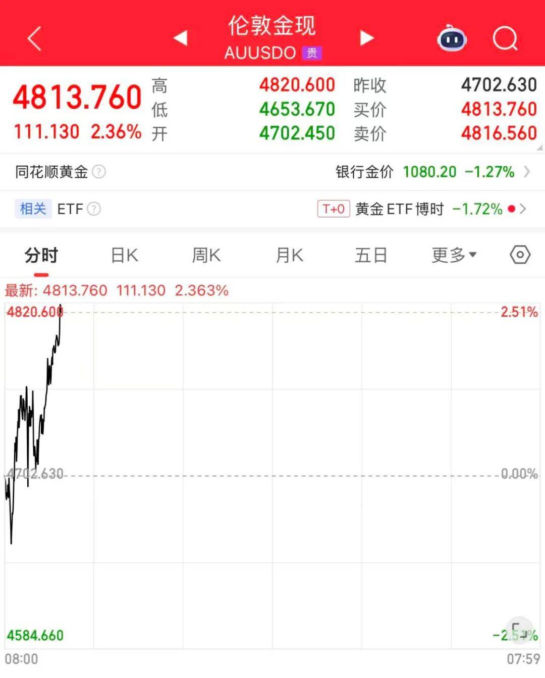 北京时间2月6日,现货黄金(伦敦金现)强势反弹。截至10时30分,伦敦金现上涨2.36%,盘中最高涨至4820.60美元/盎司。