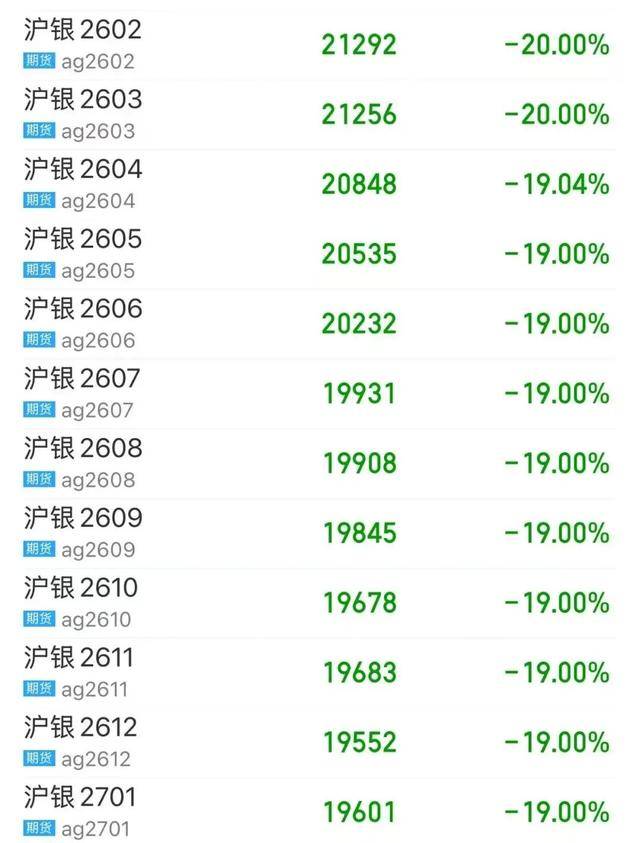 期货日报记者注意到,上海期货交易所在1月30日公告调整白银期货相关合约涨跌停板幅度和交易保证金比例,自2026年2月3日(星期二)收盘结算时起,白银期货AG2605至AG2701九个合约的涨跌停板幅度调整为17%,套保持仓交易保证金比例调整为18%,一般持仓交易保证金比例调整为19%。如遇《上海期货交易所风险控制管理办法》第十三条规定情况,则在上述涨跌停板幅度、交易保证金比例基础上调整。昨日夜盘,上述白银期货合约涨跌停板幅度扩大到19%。