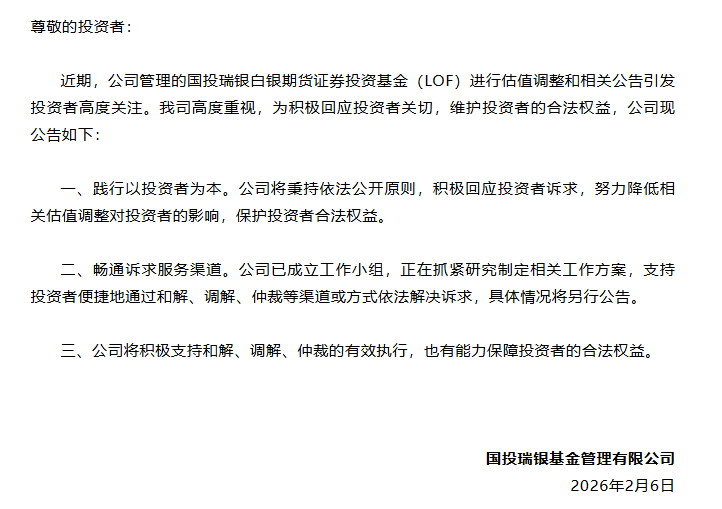 近日,国投白银LOF的估值调整引发投资者高度关注。2月6日,国投瑞银基金发布关于积极解决白银(LOF)基金投资者诉求有关事项的公告。