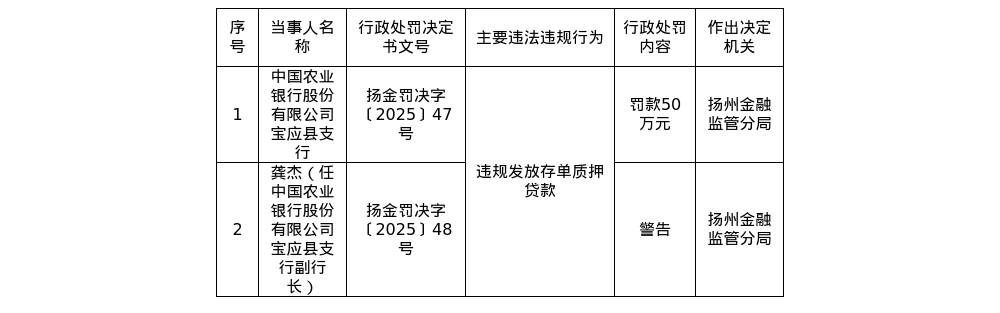 罚单显示,中国农业银行股份有限公司宝应县支行的主要违法违规事实(案由)为:违规发放存单质押贷款。
