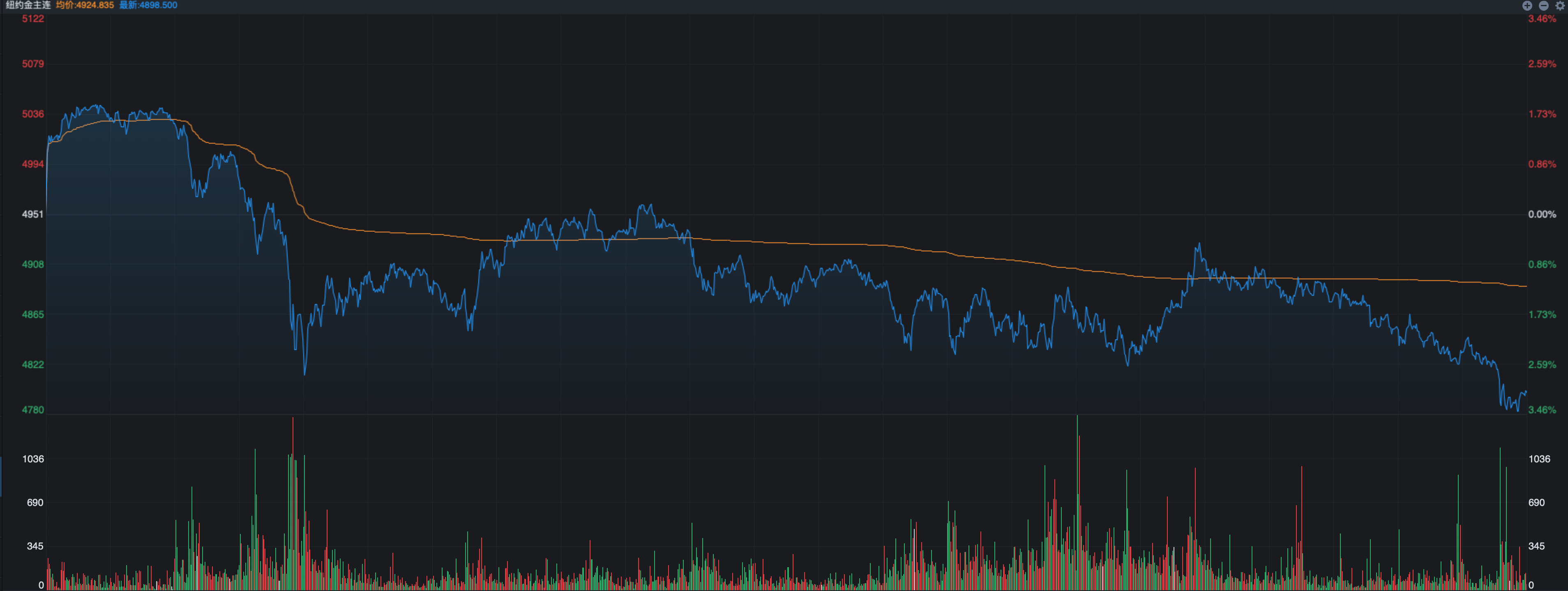 黄金的走势虽然没有白银那么夸张,然而昨夜黄金期货也下跌了3%,目前已经跌破了4800美元的大关,当然感觉黄金向下的动能似乎没有白银那么强,因为相对来说白银已经击穿了此前的低点,而黄金距离三年之前的低点还有300美元的空间。