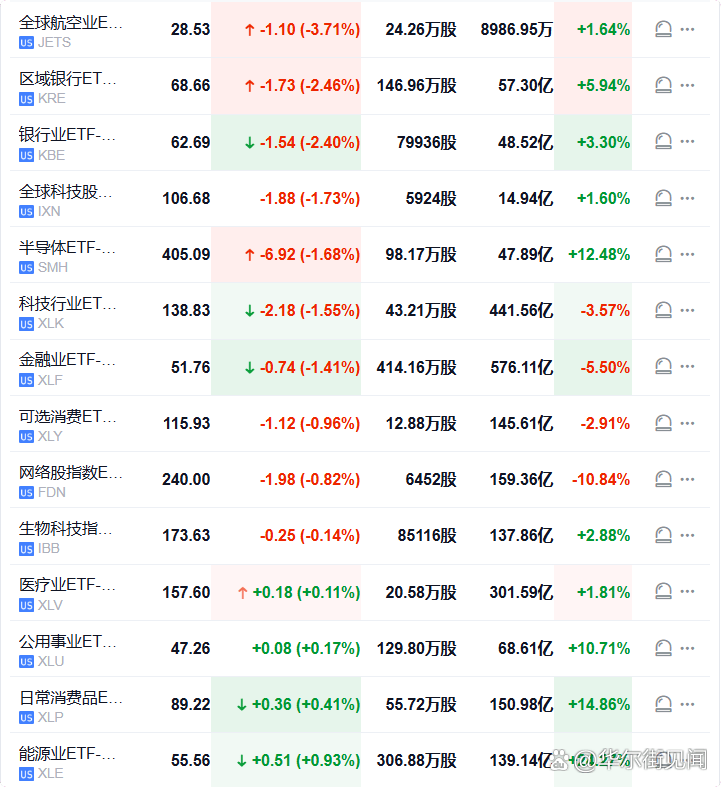 全球航空业ETF跌3.71%,区域银行ETF跌2.46%,银行业ETF跌2.4%,在美股盘初领跌行业ETF,全球科技股指数ETF、半导体ETF、科技行业ETF至多跌1.73%,能源业ETF涨0.93%。