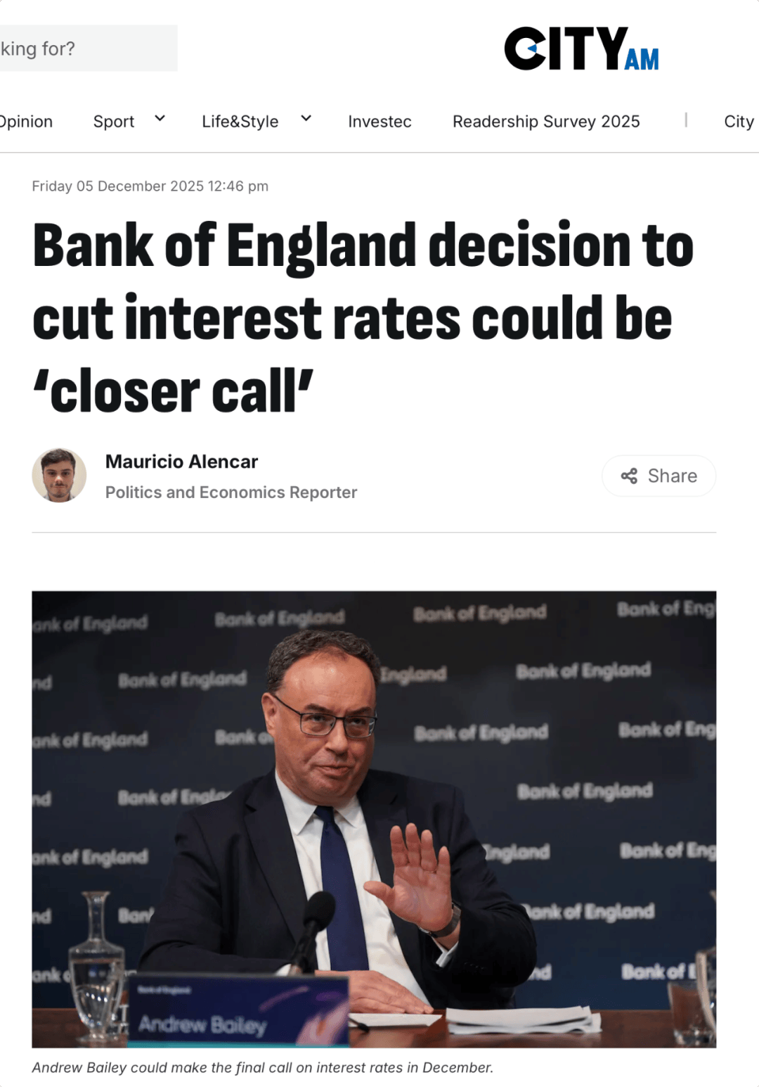 来自牛津经济研究院的经济学家认为,鉴于此前有一系列数据显示,英国通胀水平将继续下降,英国央行很可能会在未来两次会议中宣布一次降息,其中,“12月中旬宣布降息25个基点至3.75%的可能性更大"。