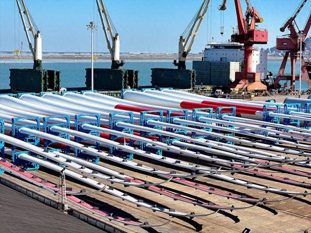 12月3日,在江苏省连云港港东方港务分公司码头,大批风电设备集港准备装船出口国外。(视觉中国)