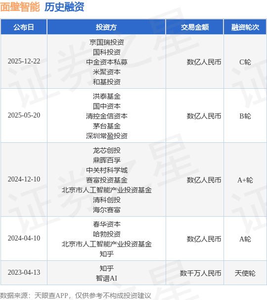 证券之星消息,根据天眼查APP于12月22日公布的信息整理,北京面壁智能科技有限责任公司C轮融资,融资额数亿人民币,参与投资的机构包括京国瑞投资,国科投资,中金资本私募,米聚资本,和基投资。