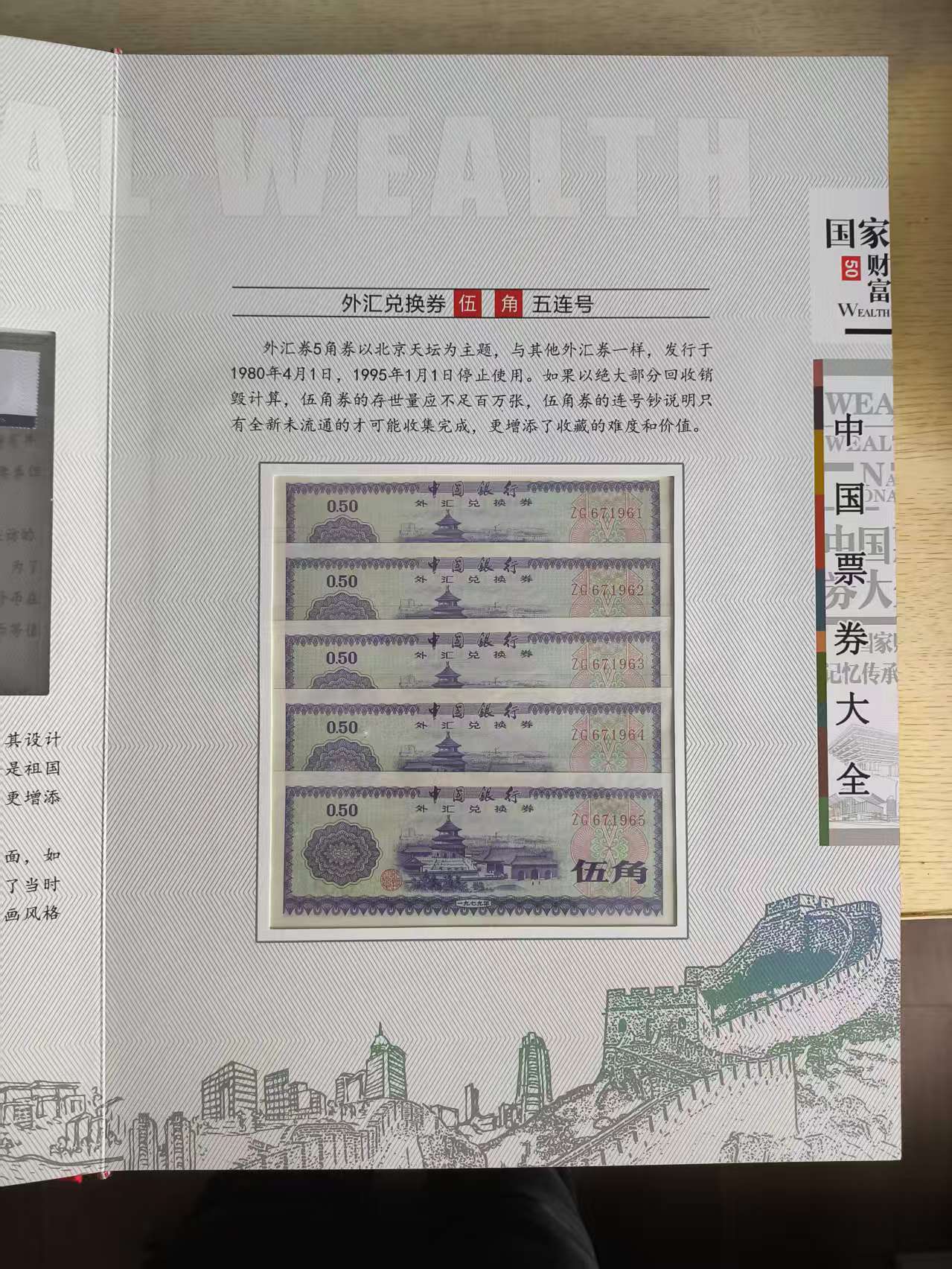 外汇兑换券的文化底蕴,是其最引人入胜的灵魂所在。全套票券共七种面值,其背面图案无一例外地选用了祖国最具代表性的名山大川与风景名胜。从气势磅礴的万里长城、雄奇险峻的长江三峡,到庄严肃穆的北京天坛、秀美如画的杭州西湖,这些图案不仅是地理标识,更是中华文明与壮丽河山的象征。通过艺术化的处理,将自然景观的恢弘与人文历史的厚重完美融合于方寸之间,方寸之地尽显千里江山,使人直观感受到祖国的地大物博与文化的博大精深。