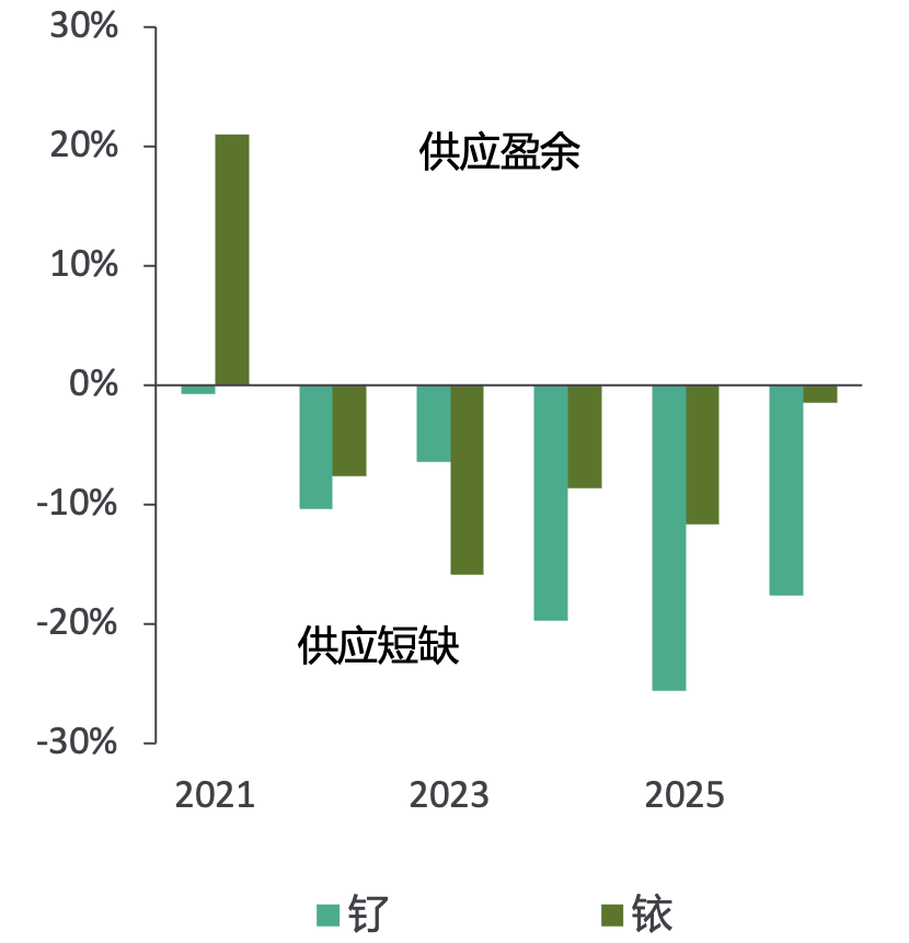 展望2026年,预计铑价格将进一步走高,全年均价有望上升近50%。近期政治层面的信号显示,欧盟净零排放目标可能出现放缓或延后,这在一定程度上减轻了市场对汽车领域长期用铑需求下行的担忧,并在流动性本就有限的市场中重新激发了投机兴趣。目前,铑交易所交易产品(ETP)持仓规模已升至2020年以来的最高水平。供需方面,预计供应端将在回收量增加的带动下小幅改善,而需求整体将维持相对平稳。然而,铑市场预计将连续第五年维持供不应求状态,因此地面存量料将继续下降。在极度缺乏流动性的市场环境下,轻微的情绪变化就可能引发大幅价格波动。由此,即便节约用量、替代与回收趋势持续存在,铑价格仍具备维持较高均价水平及更宽波动区间的基础。