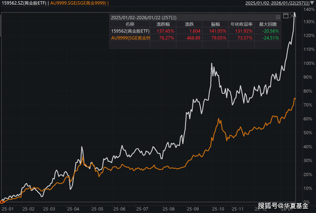 有种说法:黄金股是金价“放大器”,比如对比黄金股ETFSGE黄金9999二者的走势,2025年年初以来黄金股ETF二级市场价格涨了137%,确实明显好于后者。
