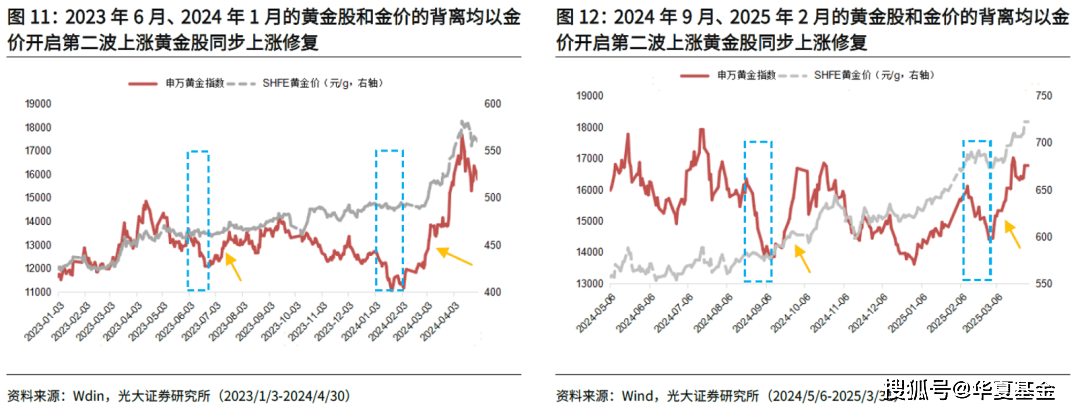 主要原因为金价新高横盘震荡之后,市场对于金价高位的可持续性存在疑虑,并且在商品价格处于历史新高时,股票市场容易出现“抢跑”现象。比如2023年6月、2024年1月、9月和2025年2月,都出现过金价横盘黄金股下跌的情形,但随着金价之后继续的上涨,黄金股通过大幅上涨与金价的关系实现了修复。