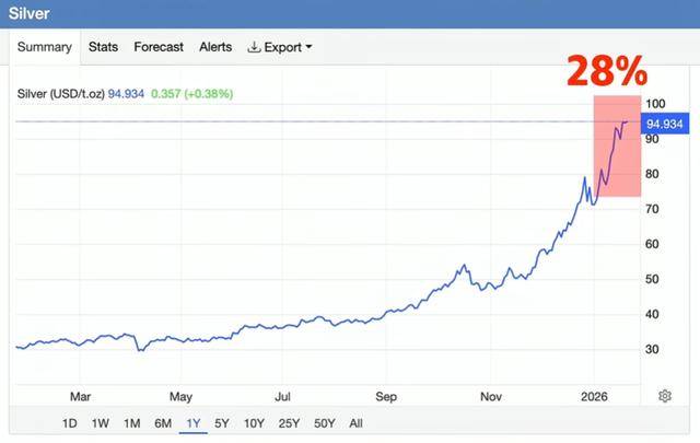 然而更惊人的是其涨幅节奏:2025年初白银还在28–29美元徘徊,年底已飙升至84美元,全年暴涨147%,远超比特币、英伟达和标普500等所有主流资产。进入2026年,涨势未歇:1月14日直冲92美元,短短三周内从72美元跃升20美元,涨幅超28%。