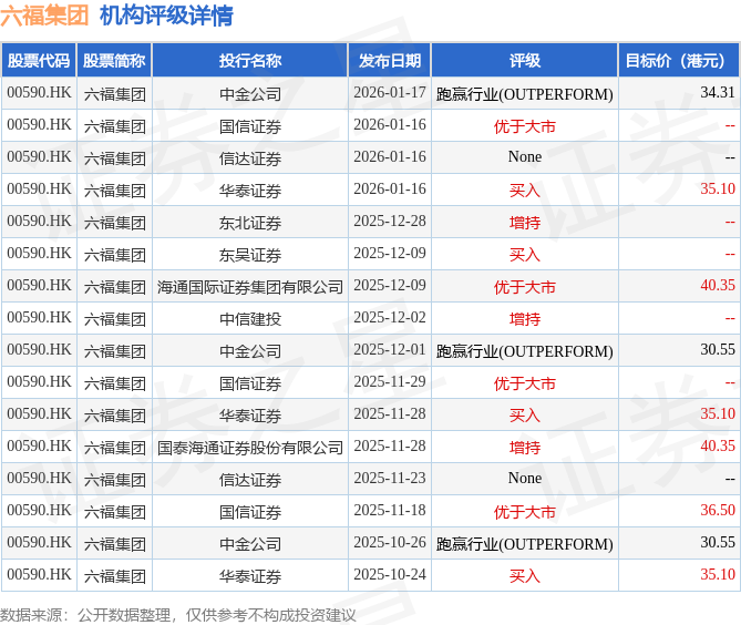 投行对该股的评级以优于大市为主,近90天内共有4家投行给出优于大市评级,近90天的目标均价为35.32港元。中金公司最新一份研报给予六福集团跑赢行业(OUTPERFORM)评级,目标价34.31港元。