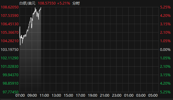 据Choice数据,1月26日,国际现货白银日内涨幅扩大至5%,截至10:32报108.58美元/盎司,涨5.21%。