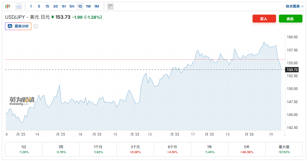 上周五,日元曾一度出现近六个月来的最大单日涨幅。周一,日元继续走高。截至发稿,美元兑日元汇率跌1.28%,报153.73,为去年11月以来的最低水平。