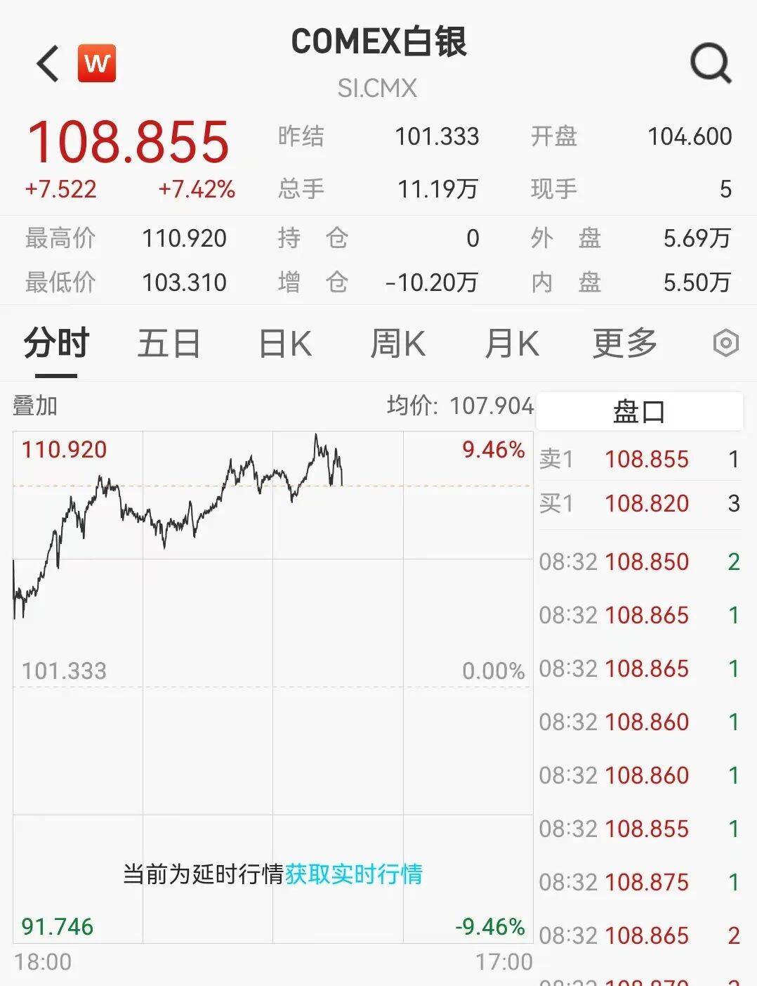 白银也盘中突破110美元/盎司,日内涨幅超过9%。