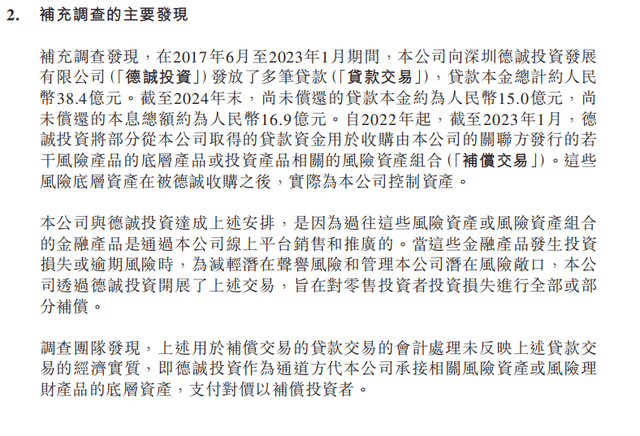 根据披露,在2017年至2023年期间,陆控向第三方深圳德诚投资发展有限公司提供了总计38.4亿元贷款。从2022年起,德诚投资将部分贷款资金用于收购由陆控关联方发行的风险产品底层资产,陆控称透过德诚投资开展了上述交易,旨在对零售投资者投资损失进行全部或部分补偿。