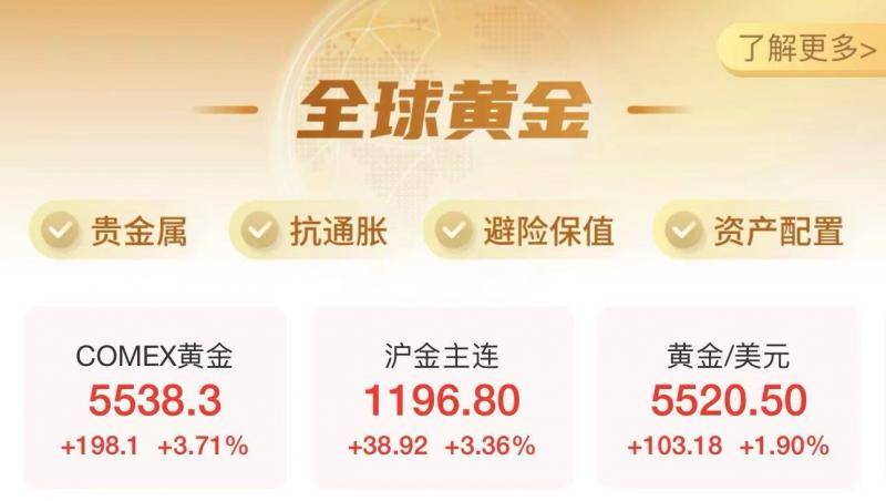 1月29日,COMEX黄金期货、现货黄金均首次突破5500美元/盎司大关。截至发稿时,COMEX黄金期货涨3.71%,报5538.3美元/盎司;现货黄金涨1.9%报5520.50美元/盎司。