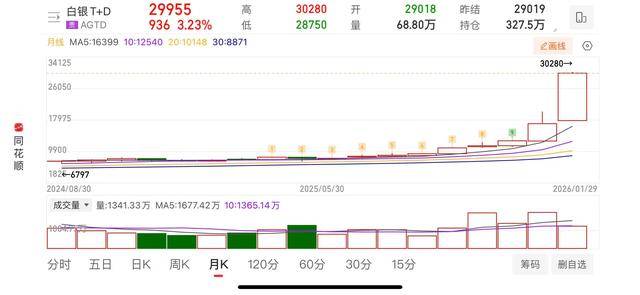 1月29日,亚市盘中,银价延续昨日涨势,国际银价向上触及120美元上方再创历史新高。其中,伦敦现货白银最高触及120.430美元,国内白银价格最高触及30.28元/克的高位,连续第六个交易日走高。