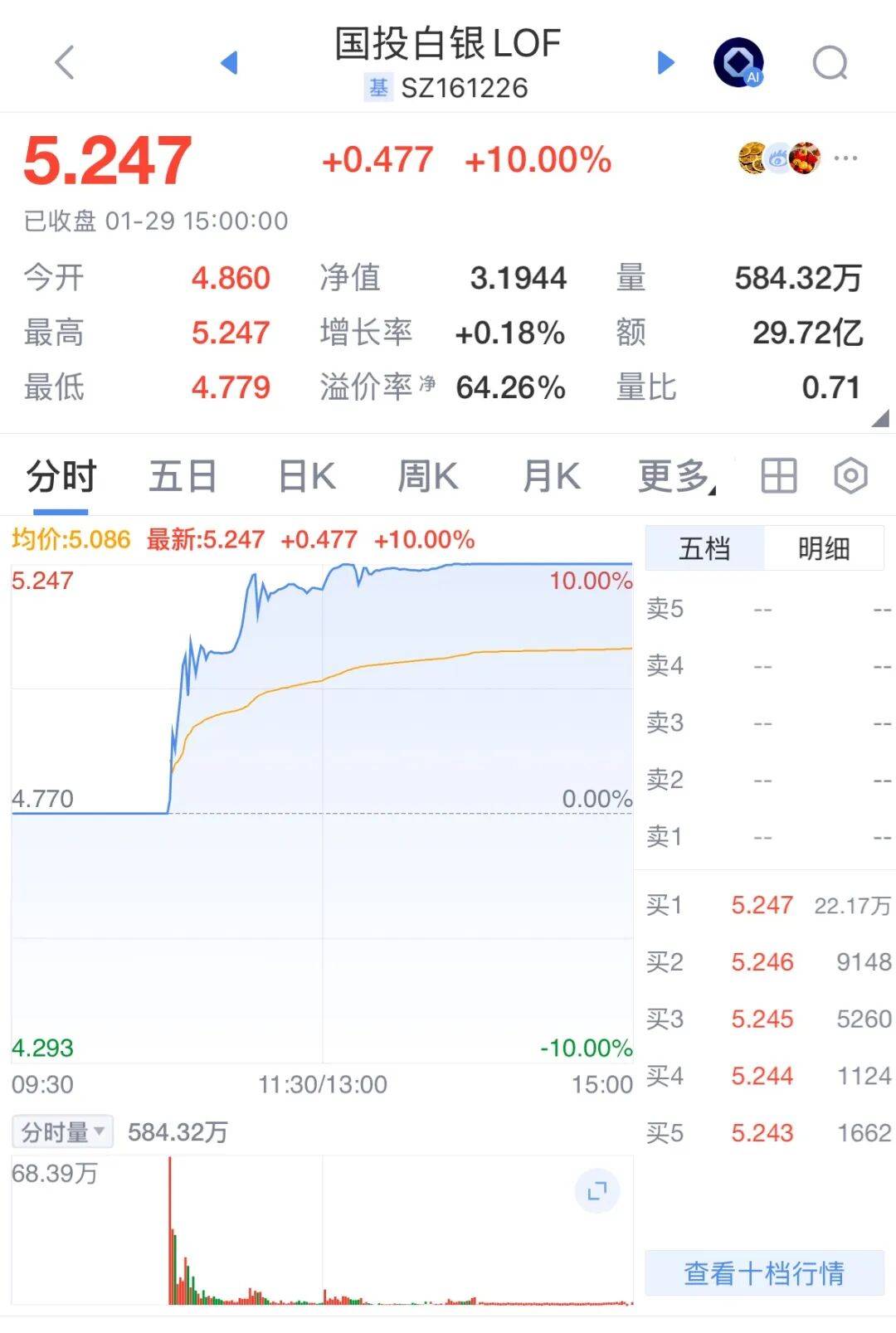 境内唯一主打白银期货投资的基金——国投白银LOF公告, 本基金将于2026年1月30日开市起停牌至收市。若本基金2026年2月2日二级市场交易价格溢价幅度未有效回落,本基金有权通过向深圳证券交易所申请盘中临时停牌、延长停牌时间等措施,向市场警示风险,具体以届时公告为准。
