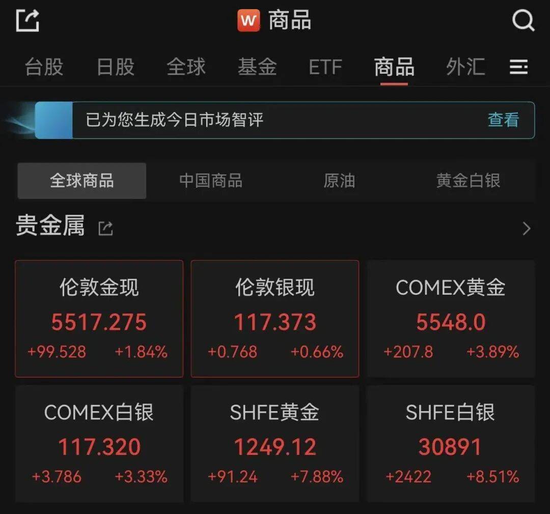1月29日, 国际金价再次大幅上涨,现货、期货双双站上5500美元/盎司,其中,黄金期货一度突破 5600美元/盎司关口。截至17时50分,COMEX黄金报5548.0美元/盎司,上涨3.89%;伦敦金报5517.275美元/盎司,上涨1.84%。