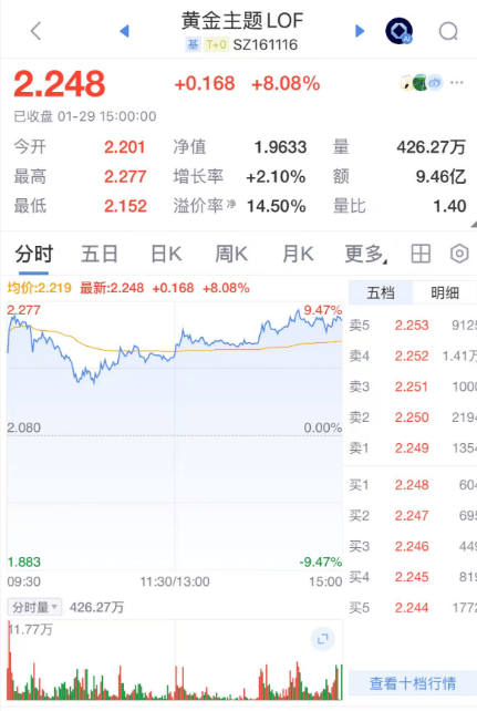 根据易方达黄金主题LOF最新披露的净值,1月27日该基金净值为1.9633元/份,二级市场价格相比之下溢价14.5%。