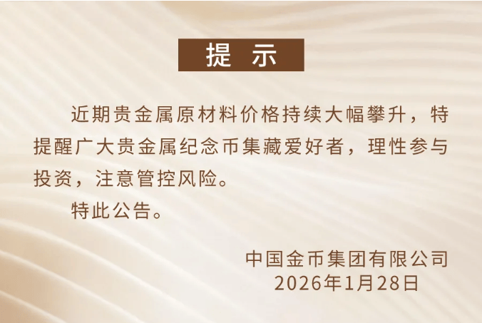 1月29日,中国金币集团发布公告,近期贵金属原材料价格持续大幅攀升,特提醒广大贵金属纪念币集藏爱好者,理性参与投资,注意管控风险。