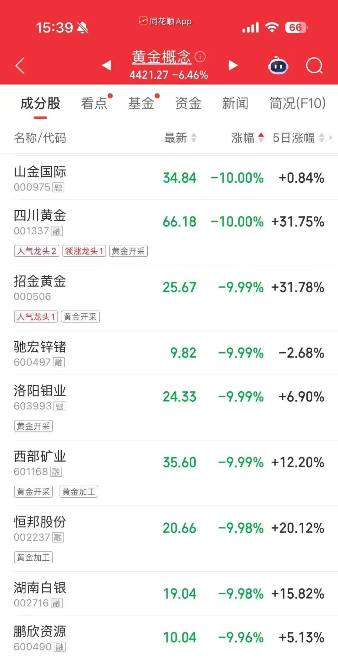 同日,A股黄金概念板块掀“跌停潮”。云南铜业、白银有色、江西铜业、中金黄金、山东黄金、四川黄金、招金黄金、西部矿业等大面积跌停。