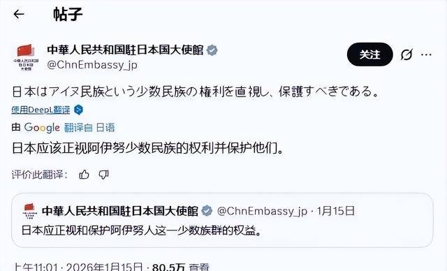日本这事儿又闹出来了。2026年1月15日,中国驻日本大使馆在社交平台上直接发声,说日本得好好面对阿伊努少数民族的权利问题,得保护他们。这话一出,日本那边右翼网友立马炸锅,各种跳脚攻击。但你想想,他们越急眼,就越说明戳到痛处了。