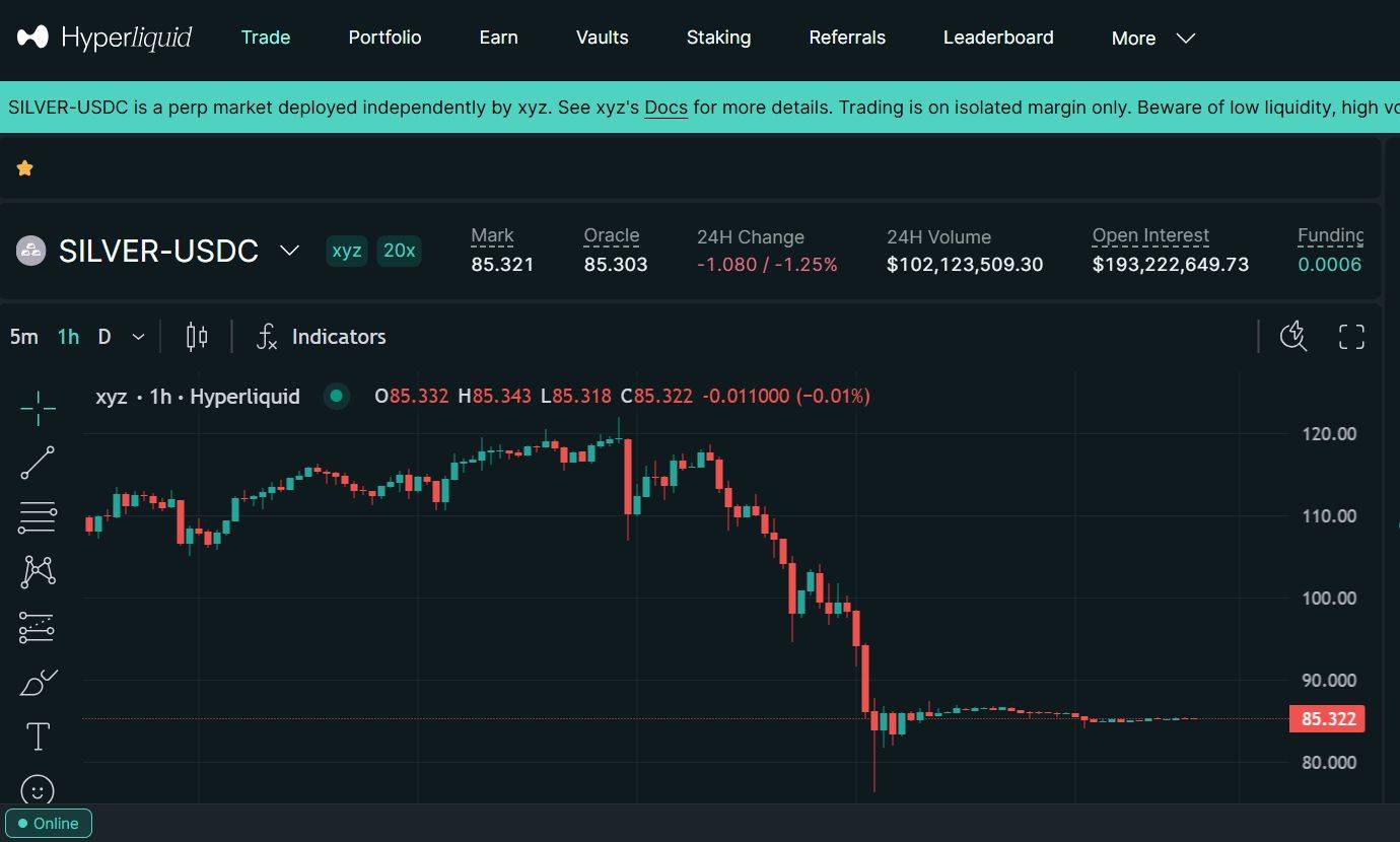Hyperliquid: 白银/USDC合约24小时交易量逾1亿美元;