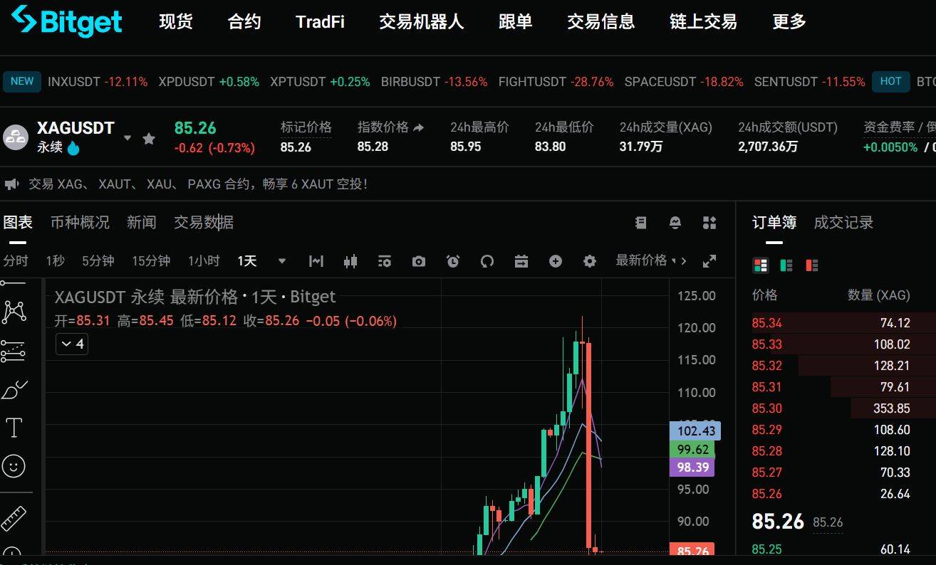 现货白银价格遭遇“史诗级”暴跌,日内最高跌幅达36%,最低下探至74.28美元/盎司。这一传统贵金属市场的极端寒流,竟意外击穿了加密货币市场的防线,引发了一场罕见的“跨界”连锁崩盘。