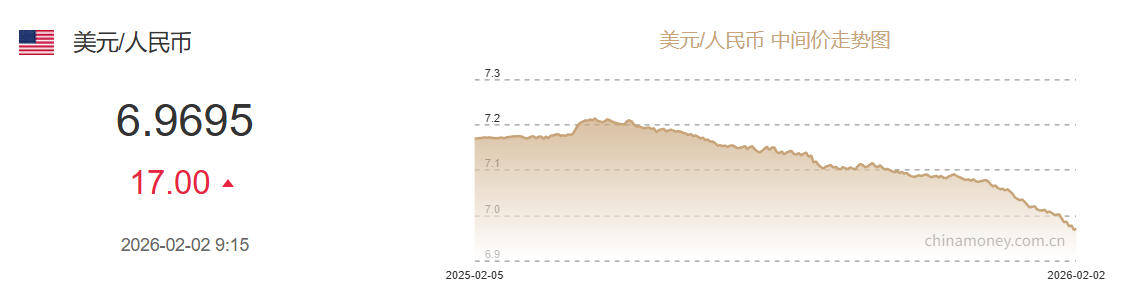 中新网2月2日电 据中国外汇交易中心网站消息,中国人民银行授权中国外汇交易中心公布,2026年2月2日银行间外汇市场人民币汇率中间价为:1美元对人民币6.9695元,下调17个基点。