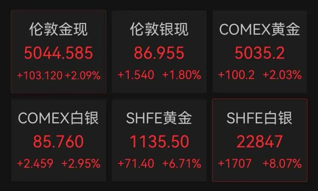2月4日,国内商品期货早盘开盘,多数上涨。截至发稿,沪银期货主力合约大涨超8%,沪金期货主力合约涨超6%。
