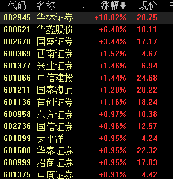 证券板块短线拉升,华林证券涨停,华鑫股份、国盛证券、中信建投、兴业证券、首创证券跟涨。