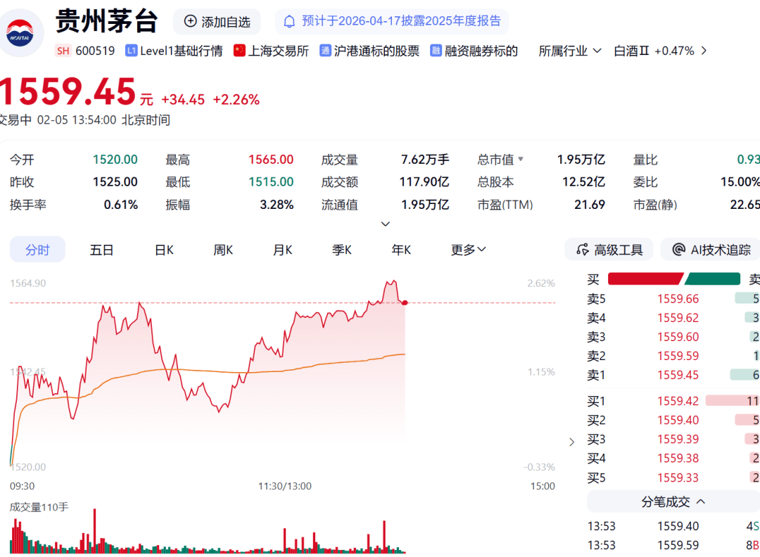 贵州茅台股价拉升,目前涨2.26%。