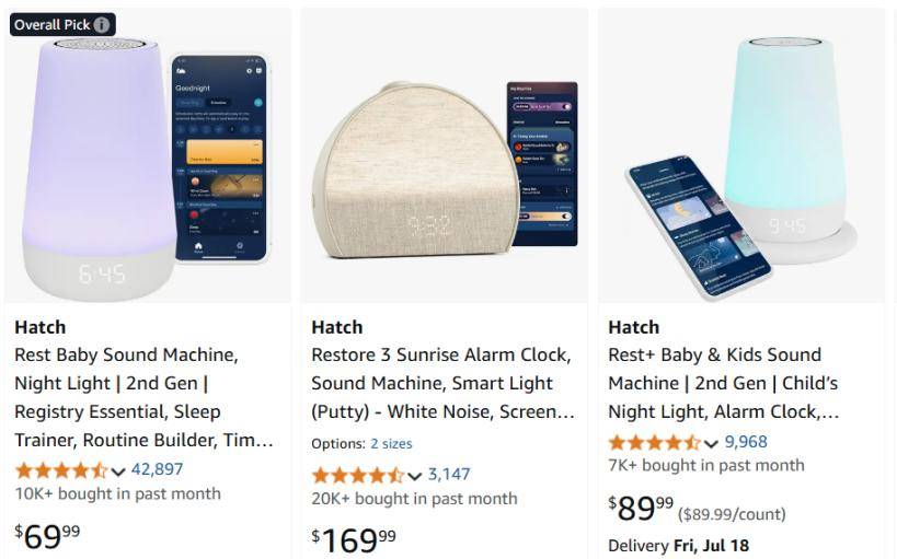 中间为 Hatch Sleep 的成人睡眠灯|图源 Amazon