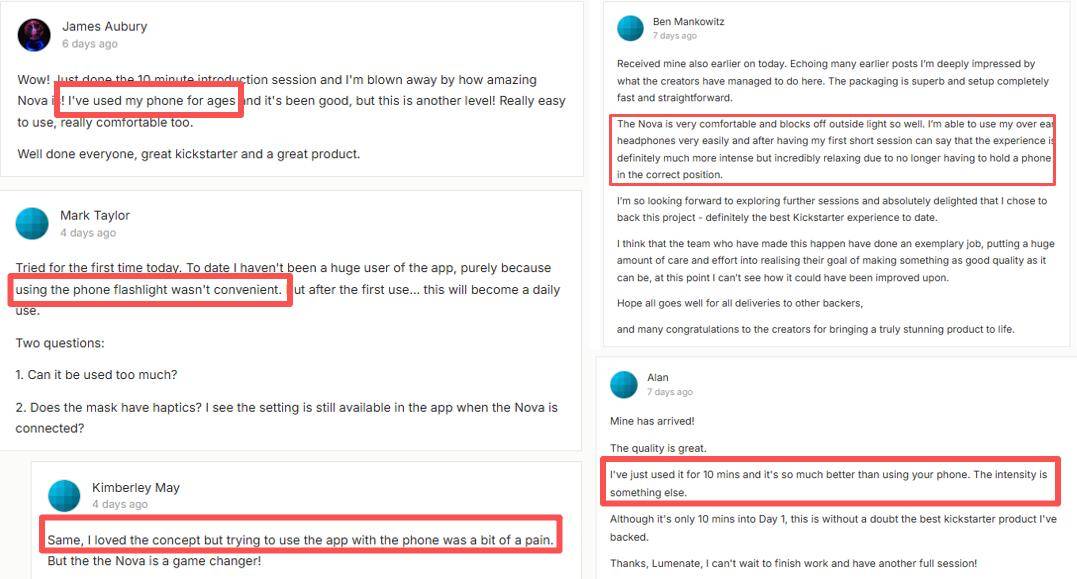 在 Kickstarter 的评论区里,这些长期积累的摩擦被被集中释放了出来。一位支持者写道“我一直在等他们出硬件,用手机真的太不稳定了”。这种表达并非个例,其配套硬件 Lumenate Nova 正是对这些隐性痛点的回应。