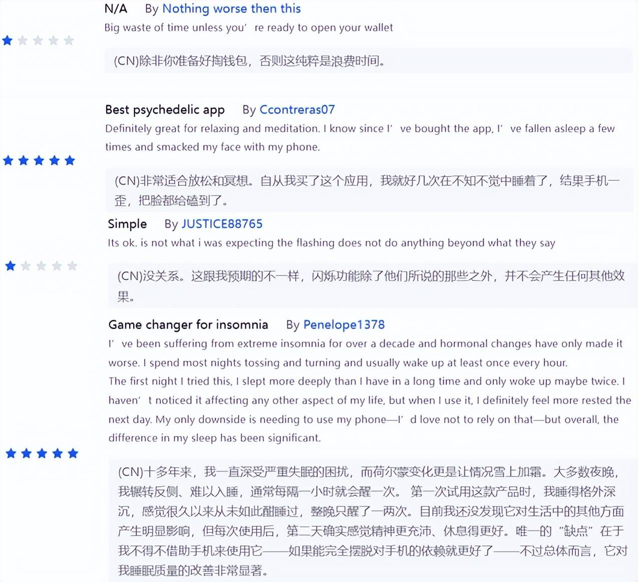 在 Lumenate 的评论区里,喜爱它的用户往往表达得极为笃定,有人描述在闪光中获得了前所未有的深度放松体验,或表示助眠效果不错。然而,另一面的声音同样强烈,有人抱怨“不适”、“毫无意义”,也有人直言浪费时间。